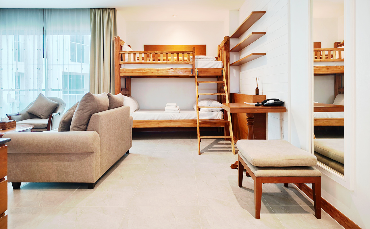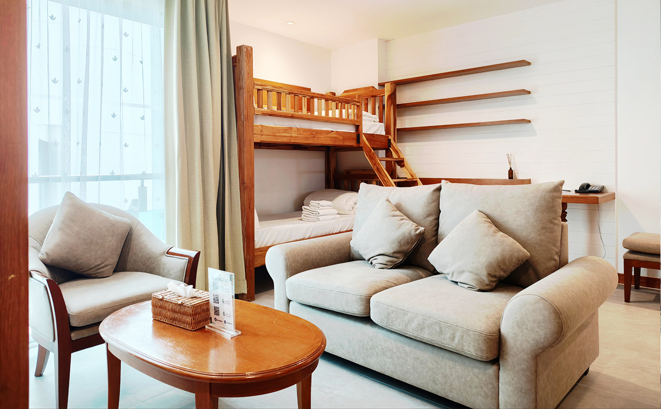 Apart from being the perfect suite for that relaxing getaway, the Family Suite with Bunk beds is as well the perfect place for an extended staycation or even a long-term rental. Get in contact with our Sales team for special offers for your extended stay at the Royal Beach View Pattaya.
